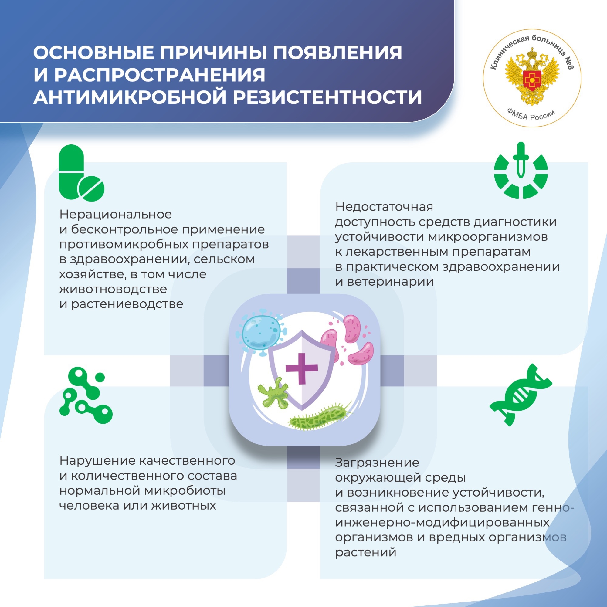 Смотрите в наших карточках основные причины возникновения и распространения антимикробной резистентности, а также ключевые правила применения антибиотиков.