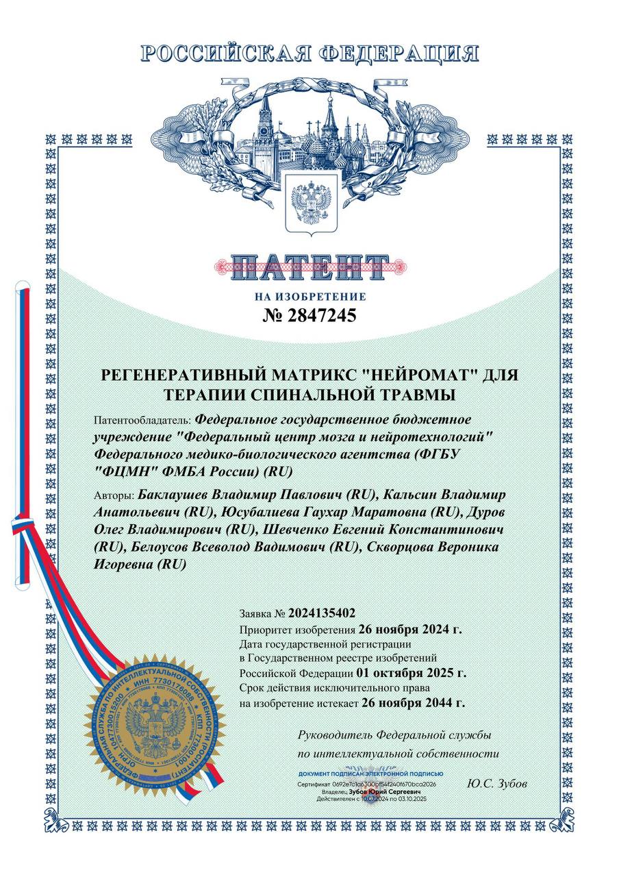 На втором этапе — через 2 месяца после травмы — производится установка стимулирующего электрода для эпидуральной стимуляции спинного мозга и активации сохранившихся в результате введения «Регенеративного матрикса „НейроМат“» структур спинного мозга (патент RU №2847297).