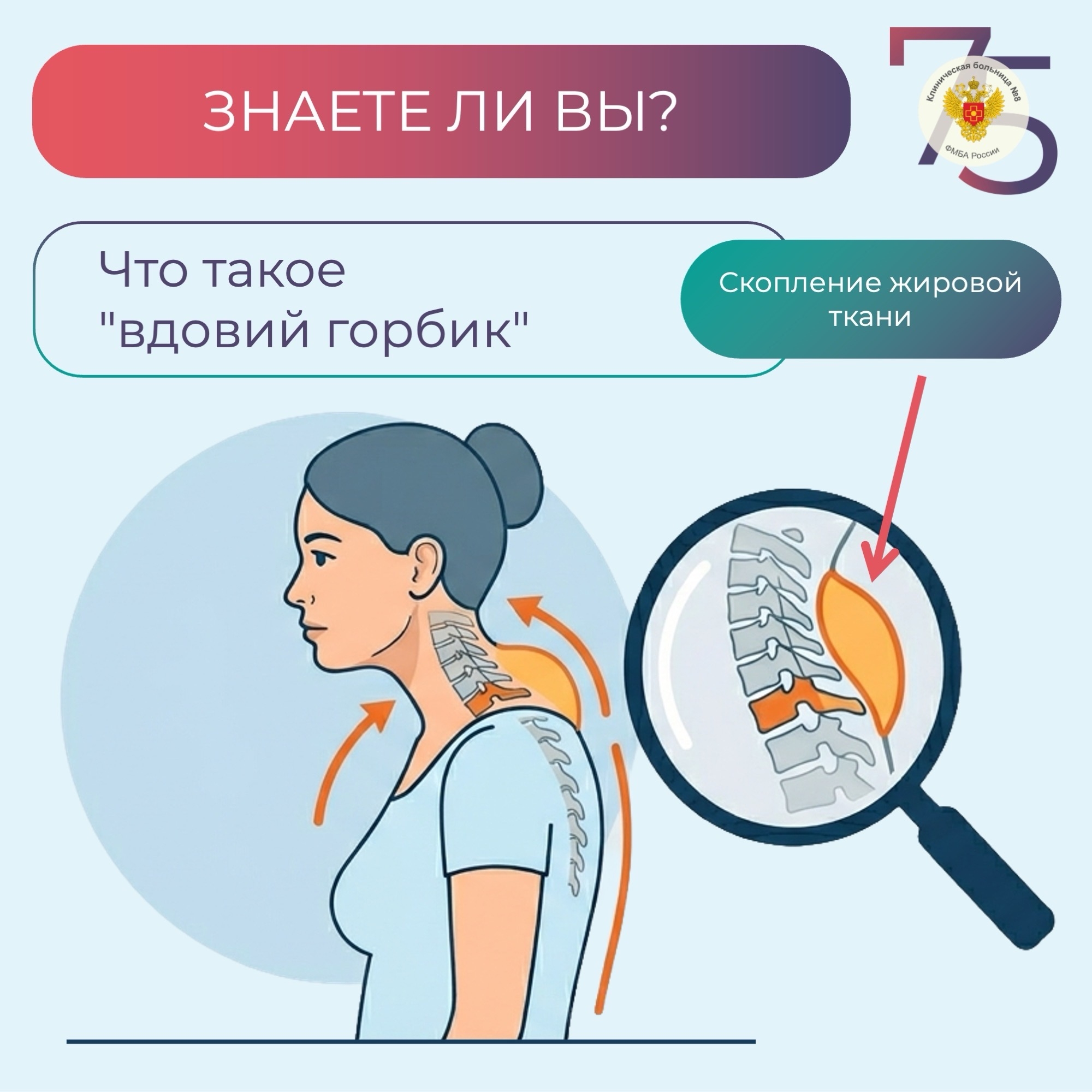 Вдовий горбик – это локальное скопление жировой ткани в области нижних шейных и верхних грудных позвонков. Внешне проявляется сутулостью, сгорбленностью фигуры. Зачастую вдовий горбик является не только эстетической проблемой: он может стать причиной возникновения боли в области плечевого пояса, щелчков и хруста при поворотах головы, нарушений сна и памяти.