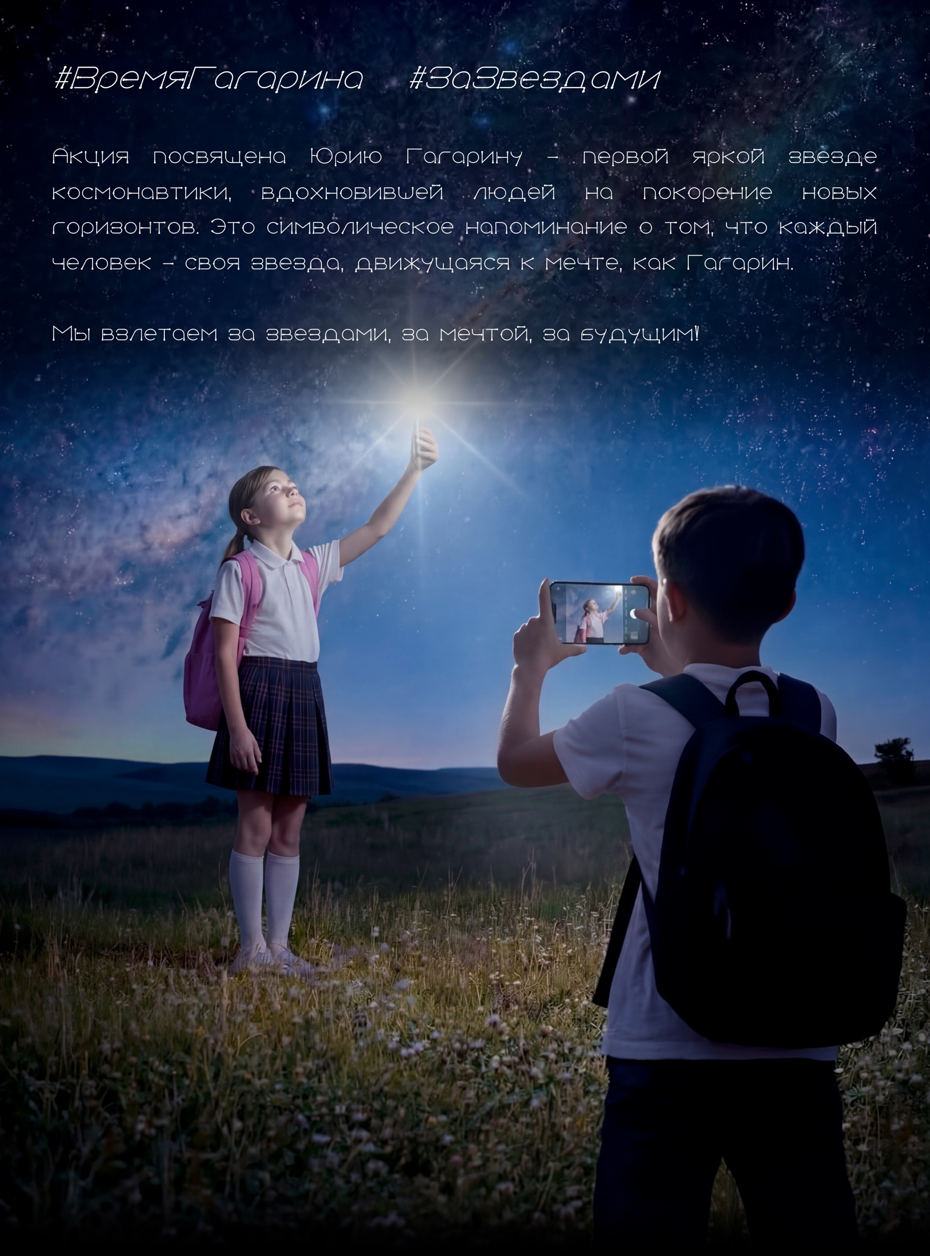 - Поделитесь фото с хэштегами #ВремяГагарина #ЗаЗвёздами