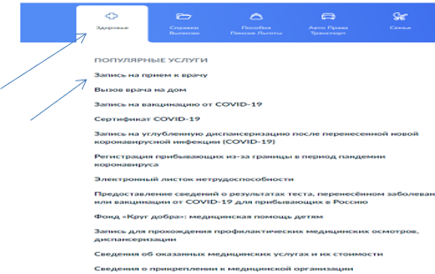 - После авторизации выбираем вкладку ЗДОРОВЬЕ и в выплывающем списке ЗАПИСЬ НА ПРИЕМ К ВРАЧУ