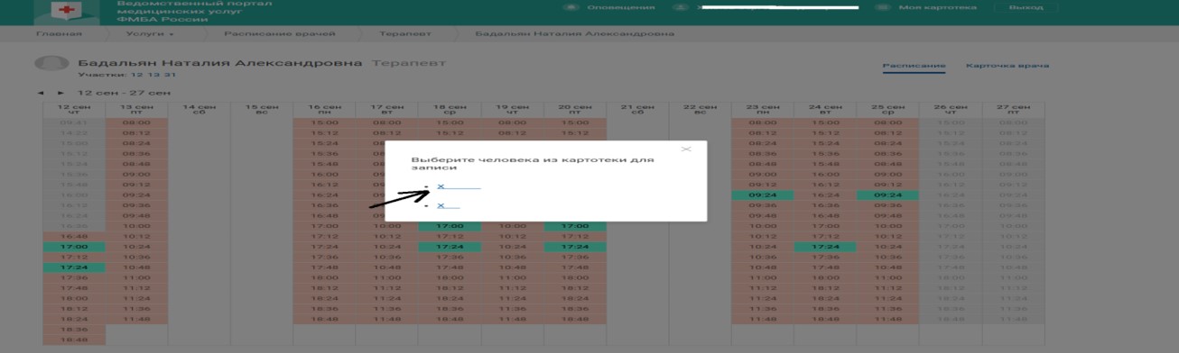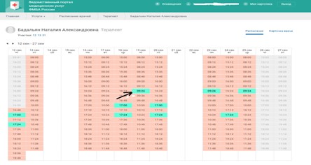 - Нажимаем на врача и переходим на страничку расписания, выбираем время и подтверждаем запись (свободные ячейки подсвечены зеленым цветом):